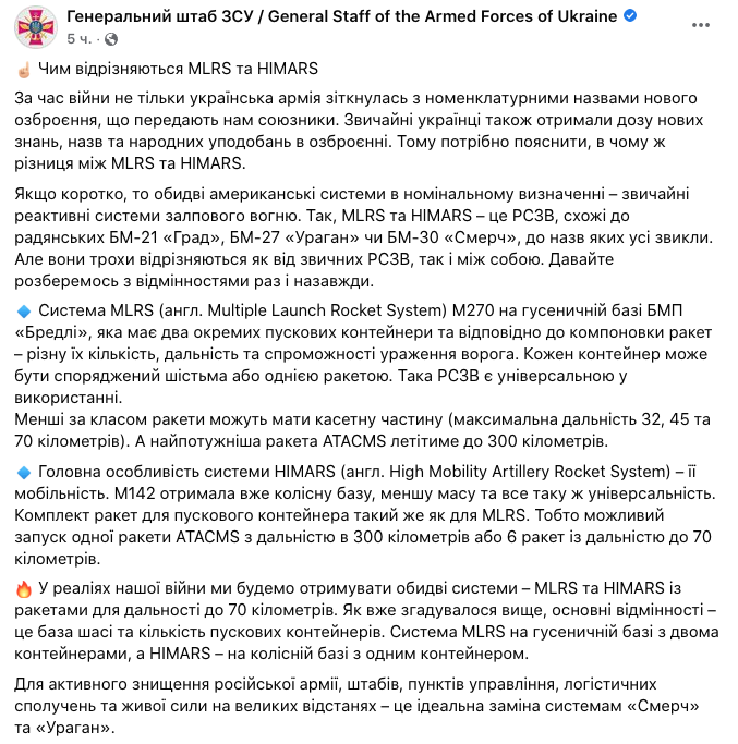 Генеральный штаб ВСУ разъясняет, чем отличаются системы РСЗО MLRS и HIMARS, которые поставляет Украине США.