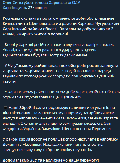 27 июня в результате ночного обстрела Харькова ракета попала по территории одной из школ в Шевченковском районе города.