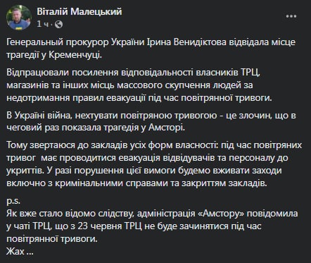Мэр Кременчуга Виталий Малецкий сообщает, что, по данным следствия, администрация подвергшегося ракетному удару "Амстора" сообщила в чате ТРЦ, что с 23 июня торговый центр не будет закрываться во время воздушной тревоги.