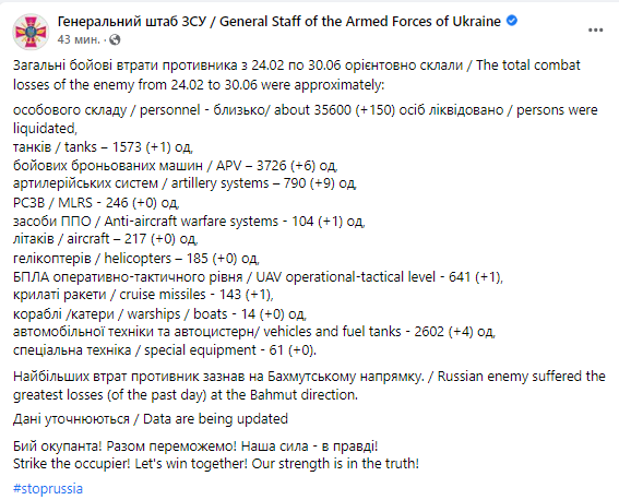 Сообщение Генштаба ВСУ опубликовано в Facebook.