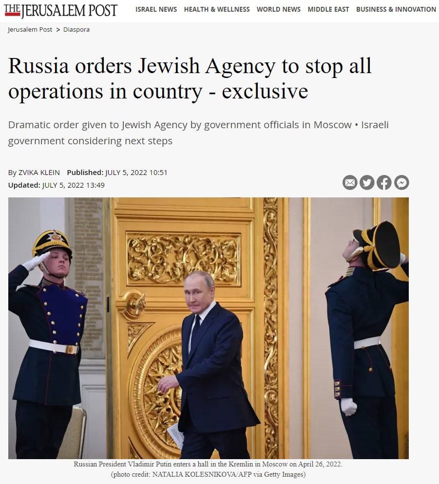 Россия предписала Еврейскому агентству (Сохнут) прекратить свою деятельность в стране.