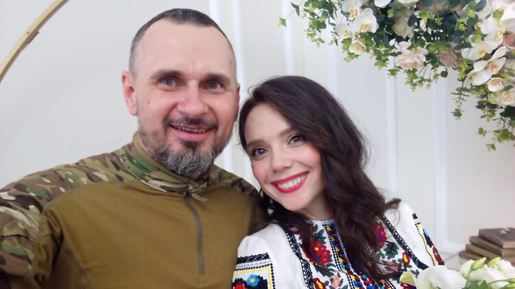 На фото Сенцов одет в военную водолазку, а его жена - в вышиванку.