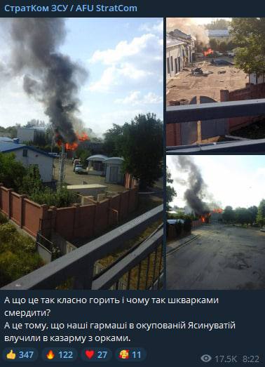 Управление стратегических коммуникаций ВСУ сегодня заявило, что нанесен удар по казарме противника в Ясиноватой в "ДНР". Отметим, что это один из немногих случаев, когда украинские военные официально подтверждают обстрел городов на неподконтрольных территориях.