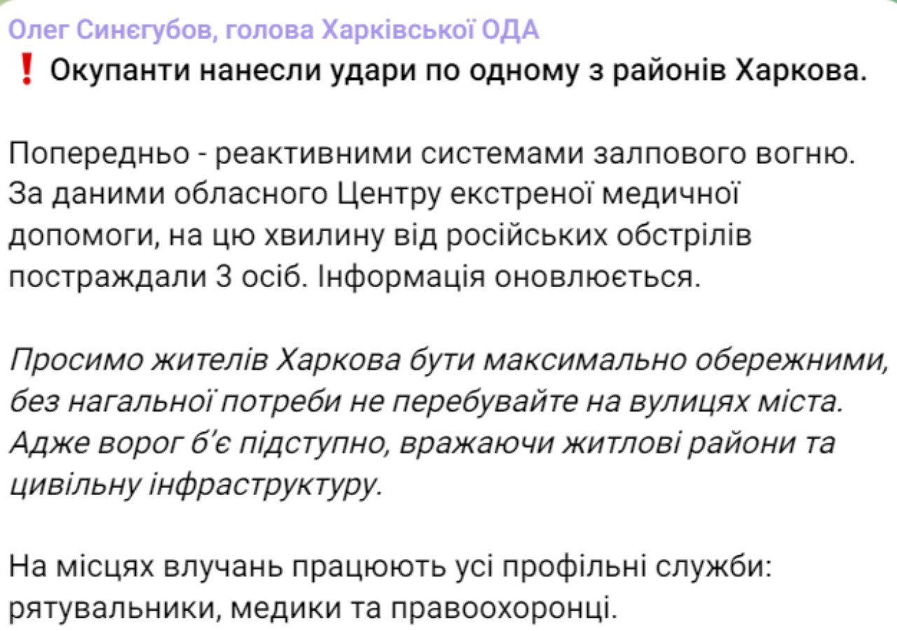 Предварительно - обошлось без пострадавших, сообщил глава Харьковской ОГА Олег Синегубов.