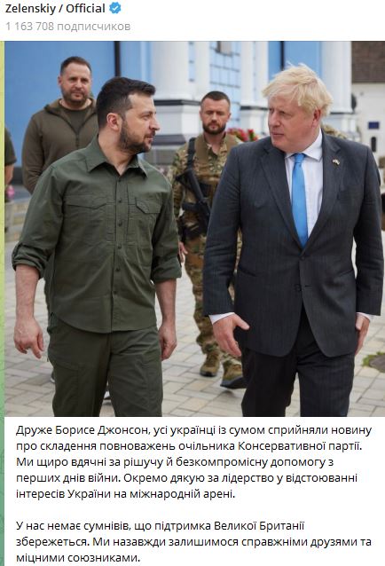 "Друг Борис Джонсон, все украинцы с грустью восприняли новость о сложении полномочий главы Консервативной партии. Мы искренне благодарны за решительную и бескомпромиссную помощь с первых дней войны. Отдельно благодарю за лидерство в отстаивании интересов Украины на международной арене" - говорится в сообщении.