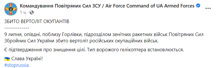 Командование Воздушных Сил Вооруженных сил Украины сообщает об уничтожении 9 июля российского вертолета под Горловкой.