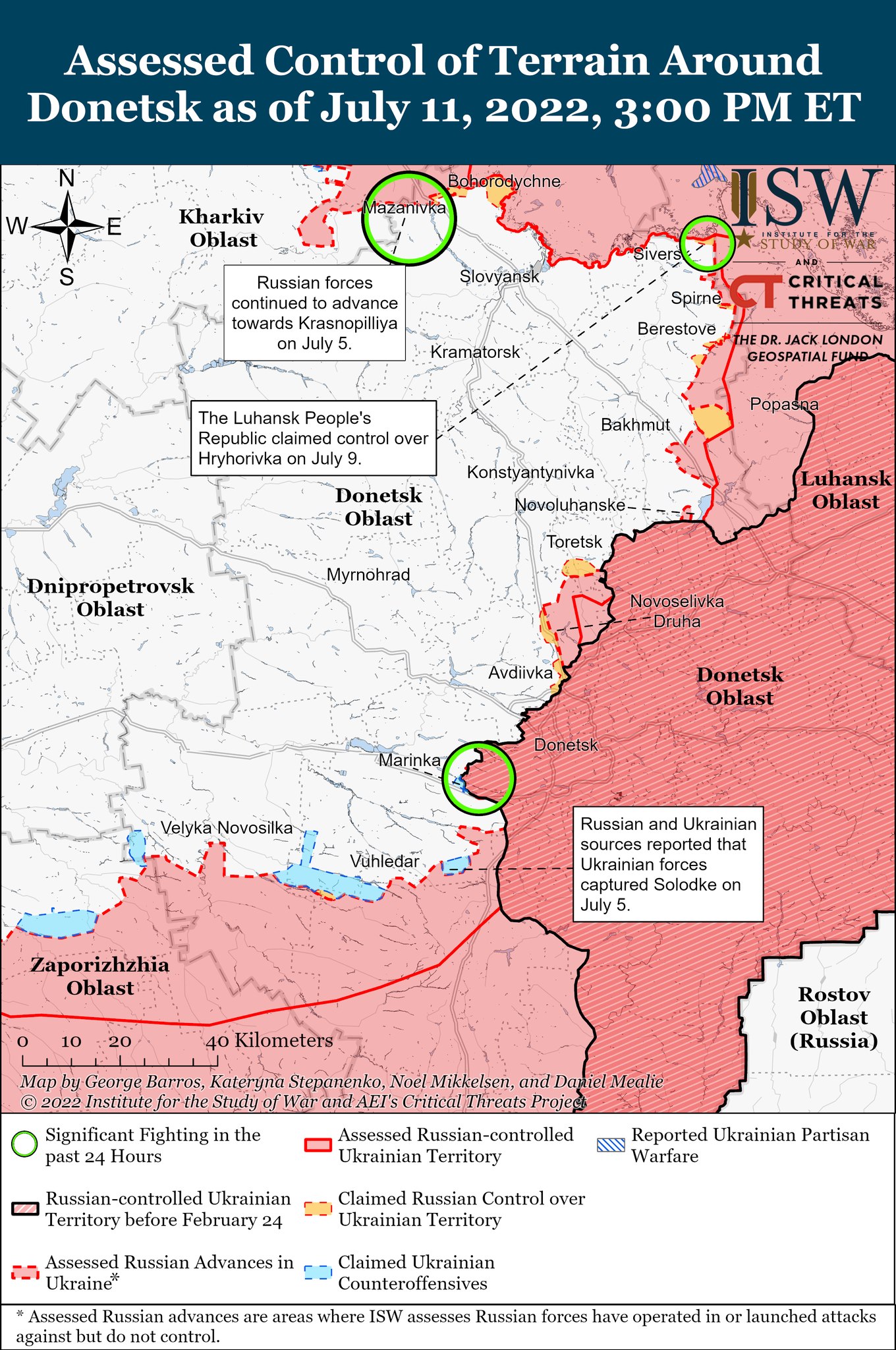 Американский Институт изучения войны в ночь на 12 июля опубликовал актуальные карты боевых действий в Украине. Сообщается, что россияне продолжают наступать в районе Славянска, а ВСУ наносят удары на юге страны.