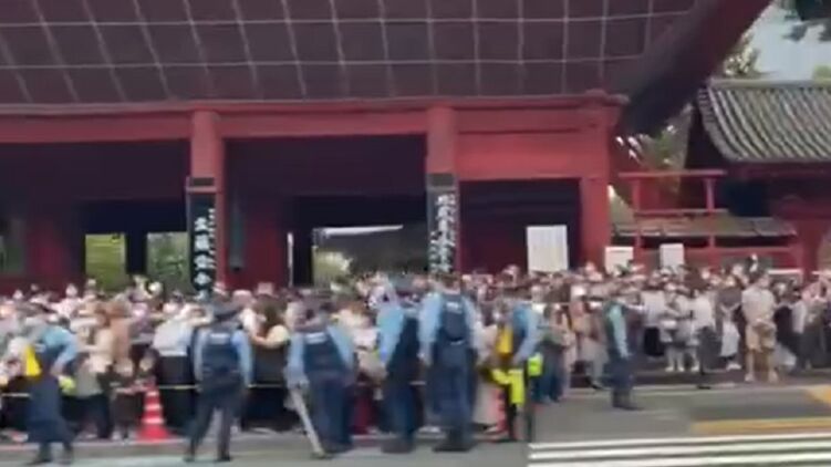 Также в сети публикуют видео, на котором видна очередь из желающих проститься с Синдзо Абэ возле храма.