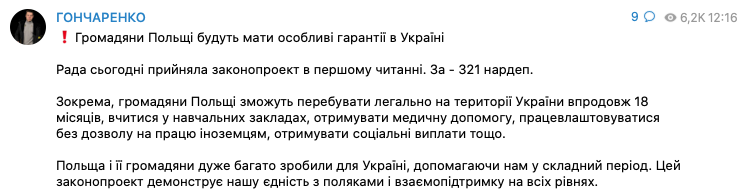 "Польша и ее граждане очень многое сделали для Украины, помогая нам в сложный период. Этот законопроект демонстрирует наше единство с поляками и взаимоподдержку на всех уровнях", - объясняет мотивацию принятия законопроекта Гончаренко.
