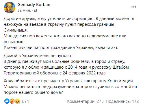 Глава штаба обороны Днепра Геннадий Корбан, у которого сегодня при въезде в Украину изъяли паспорт, обратился к президенту Владимиру Зеленскому.