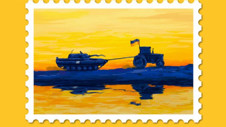 На почтовой марке "Добрый вечер, мы из Украины" воспроизведены реальные события, которые произошли в Николаевской области: украинский трактор тянет заброшенный российский танк. Автором эскиза стала дизайнер-график и преподаватель живописи Анастасия Бондарец.