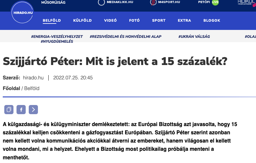 "Что значит, потребление газа в Европе нужно сократить на 15%? Каждая страна должна сократить на столько? Всем ли нужно на 15% меньше? Для промышленных потребителей? Для домовладельцев? Или кто-нибудь скажет вам, что 15% означают, что мы можем использовать гораздо меньше электроэнергии, гораздо меньше отопления, гораздо меньше энергии для приготовления пищи? Чем это обернется?", - говорит Сийярто.