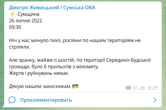 Тем временем губернатор граничащей с Брянской Сумской области Дмитрий Живицкий сообщил, что с утра было шесть минометных прилетов со стороны России.
