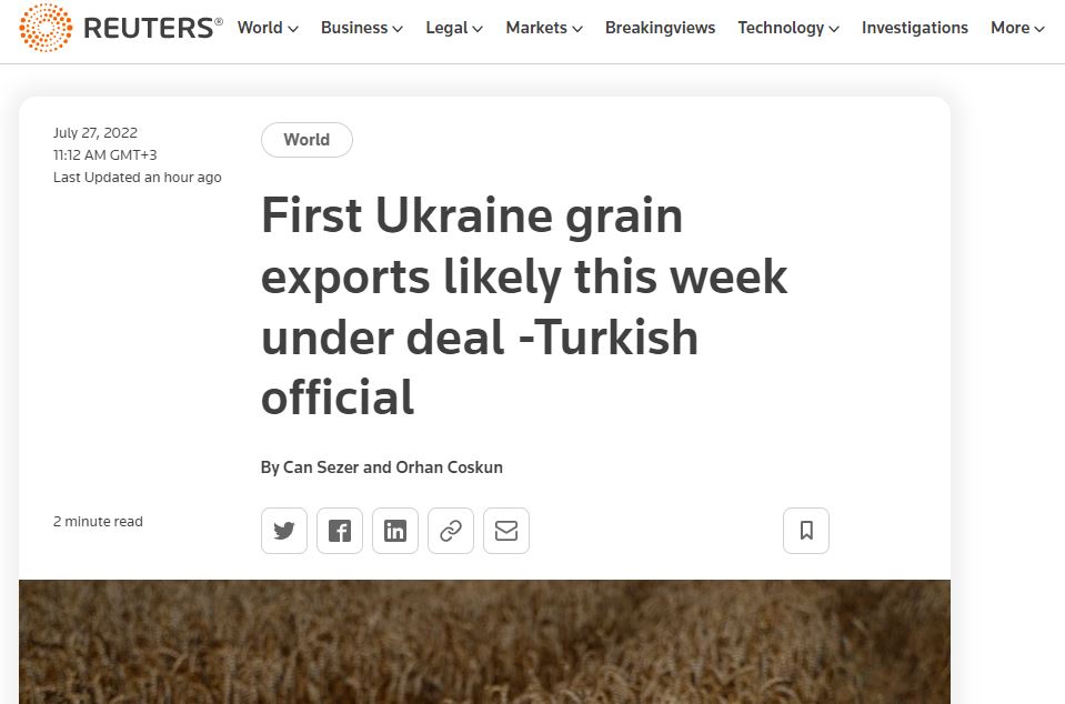 Он спрогнозировал, что экспорт может начаться через несколько дней после начала работы координационного центра в Стамбуле. Он открывается сегодня, 27 июля.