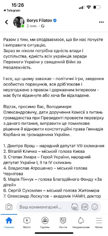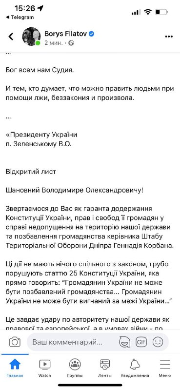 Обращаемся к Вам как гаранту соблюдения Конституции Украины, прав и свобод граждан в деле недопущения на территорию нашего государства и лишения гражданства руководителя Штаба территориальной обороны Днепра Геннадия Корбана.