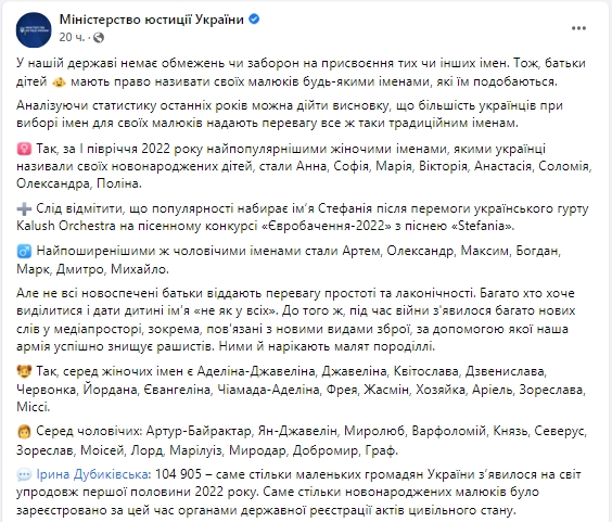 В первом полугодии 2022 года самыми популярными именами, которые дали своим новорожденным малышам украинские родители стали: Соломия, Александра, Полина, Максим, Богдан, Марк и другие. При этом некоторые украинцы решили назвать детей более оригинально, например Хозяйка или Моисей.