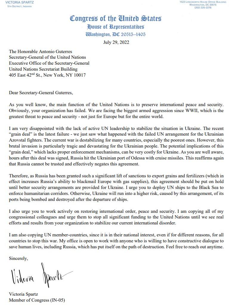 Конгрессвумен Виктория Спартц обратилась к генсеку ООН Антониу Гутеррешу с призывом приостановить "зерновое соглашение", пока Украина не получит надлежащих мер безопасности.