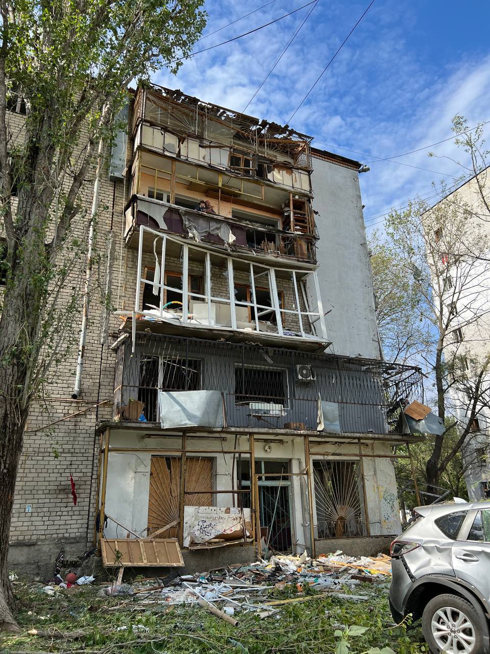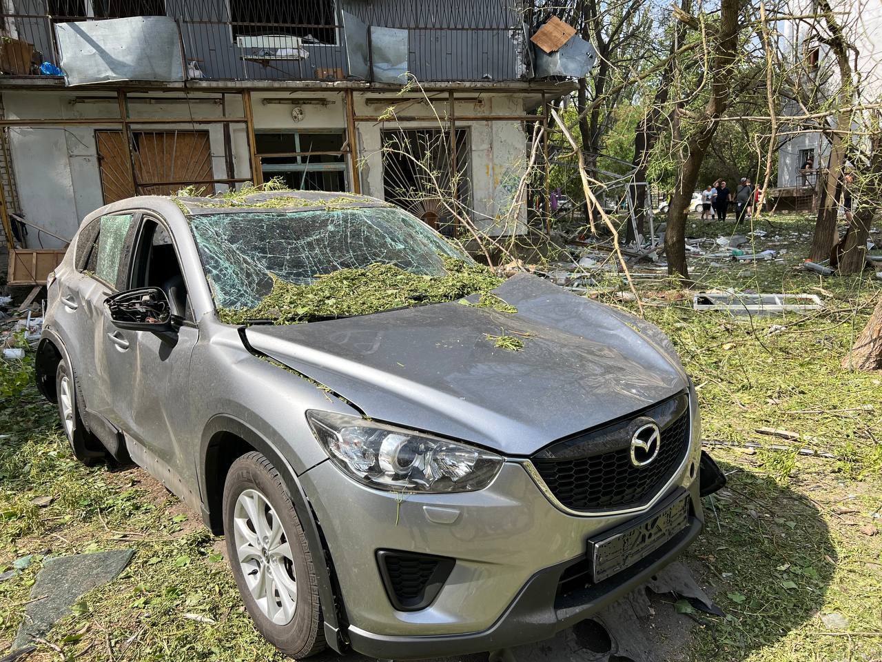 Пострадали два девятиэтажных, два пятиэтажных жилых дома, а также пятиэтажное общежитие. В домах практически полностью выбиты стекла, разрушены остекления балконов, повреждены стены. Кроме того, осколками повреждены около десятка частных автомобилей, которые были припаркованы возле домов. Головная часть ракеты упала на детскую площадку, разрушив ограждение.