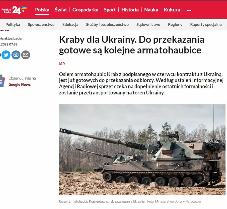 Контракт на сумму более трех миллиардов злотых предусматривает производство для украинской армии около 60 "Крабов" и дополнительных машин.
