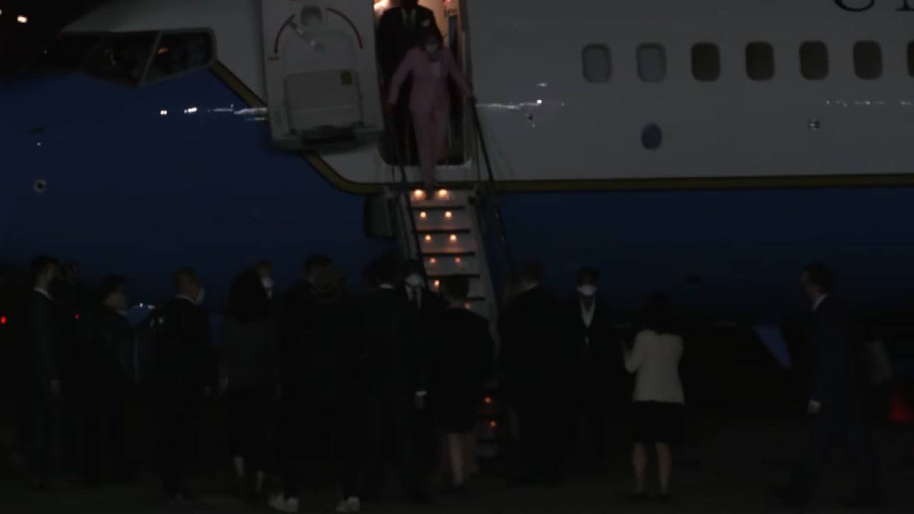 17:58 Нэнси Пелоси выходит из самолёта в Тайбэе.