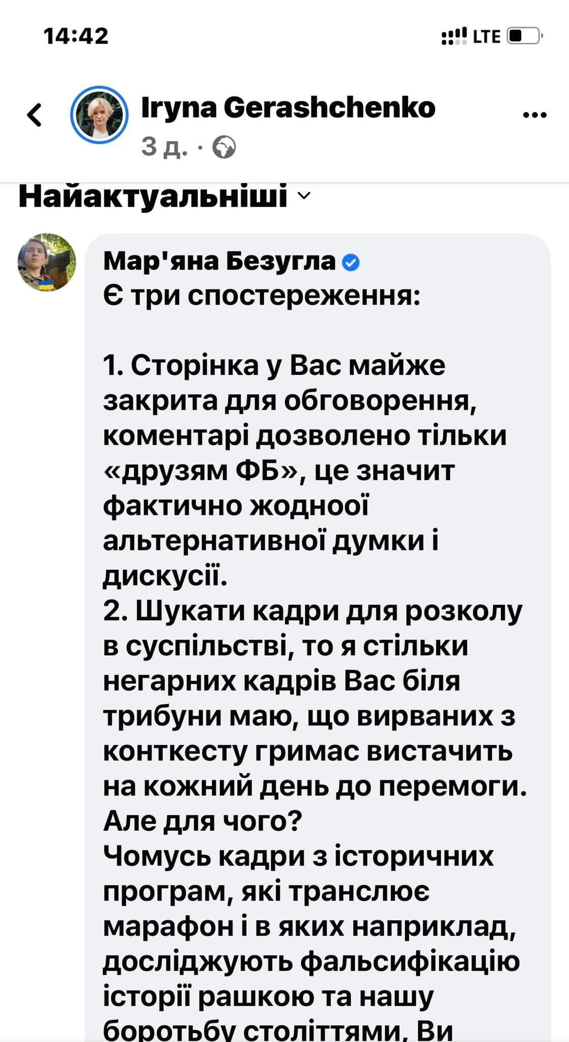 Также Геращенко обвинила "слугу народа" Марьяну Безуглую в данной провокации, основываясь на якобы странном комментарии Безуглой под одним из постов в соцсети.