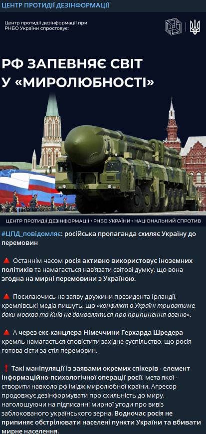 "Такие манипуляции с заявлениями отдельных спикеров – элемент информационно-психологической операции россии, цель которой – создать вокруг РФ имидж миролюбивой страны. Агрессор продолжает дезинформировать о склонности к миру, подчеркивая подписание мирного соглашения о вывозе заблокированного украинского зерна. В то же время Россия не прекращает обстреливать населенные пункты Украины и убивать мирное население", - заявляет Центр при СНБО.