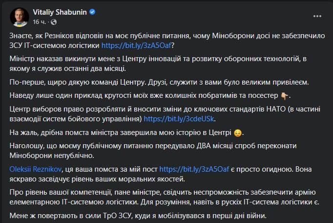 Шабунин обвинил Министерство обороны Украины в отсутствии IT-системы логистики и, по сути, в срыве поставок оружия в достаточном количестве. Эти обвинения Шабунин сделал, будучи фактически сотрудником Минобороны (был прикомандирован туда в Центр инноваций). Он также обвинил министра обороны Алексей Резникова в игнорировании своих запросов.