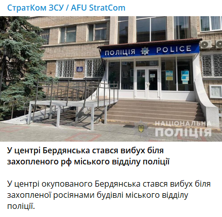 В центре захваченного россиянами Бердянска (Запорожская область) 6 августа прогремел взрыв у здания городского отдела полиции.