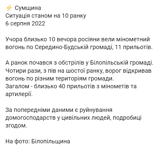 Как рассказал глава Сумской ОВА Дмитрий Живицкий, 6 августа утро началось с обстрелов Белопольской громады. Оккупанты били по территории сел с половины шестого утра.