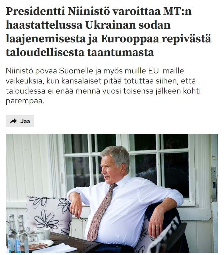 "Гражданам Финляндии и других государств ЕС придется привыкать к тому, что экономика больше не будет расти из года в год. Это может негативно повлиять на единство Европы, так как развитие внезапно останавливается, а количество вызовов увеличивается", — предсказывает президент.