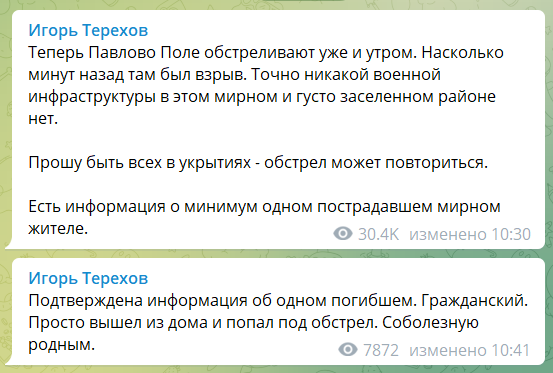Как уточнил мэр города Игорь Терехов, обстрел велся по Павловому Полю - густонаселенному району, где нет военной инфраструктуры.