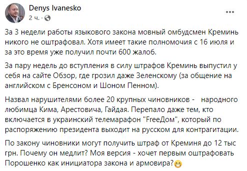 За три недели работы языкового закона мовный омбудсмен Тарас Креминь никого не оштрафовал. Хотя у него есть такие полномочия с 16 июля и за это время он уже получил почти 600 жалоб, как сообщили в его секретариате.