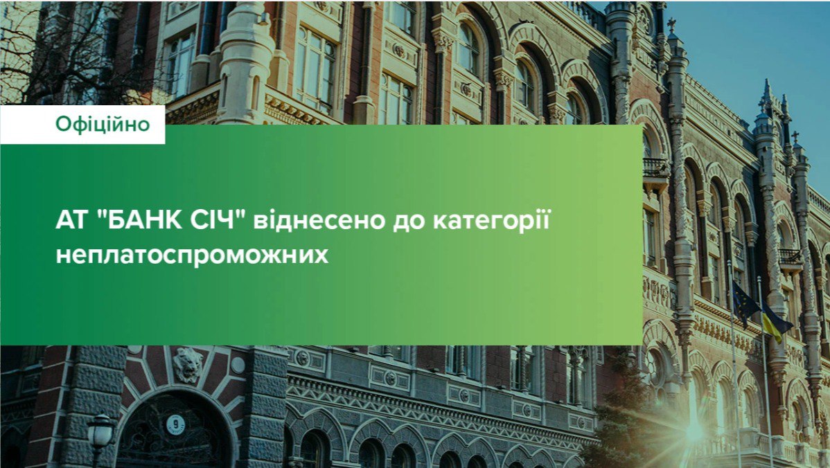 Правление Нацбанка приняло решение объявить АО "Банк Сич" неплатежеспособным в связи с невыполнением банком своих обязательств перед НБУ по кредитам рефинансирования из-за недостаточности средств.