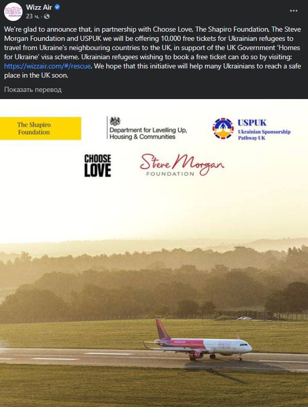 Напомним, в начале марта Wizz Air уже предоставлял 100 тысяч бесплатных билетов для украинцев.