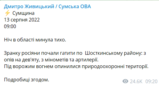 Утро в Сумской области началось с российских обстрелов, под огнем природоохранные территории - губернатор
