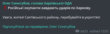 11:09 Глава Харьковской ОГА Олег Синегубов призвал жителей Салтовского района Харькова оставаться в укрытиях.