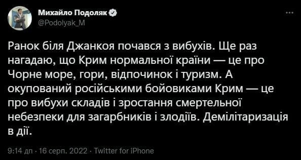 "Напоминаем: Крым нормальной страны — это Черное море, горы, отдых и туризм, а Крым, оккупированный русскими, — это взрывы складов и высокий риск гибели оккупантов и воров. Демилитаризация в действии", - написал Подоляк.
