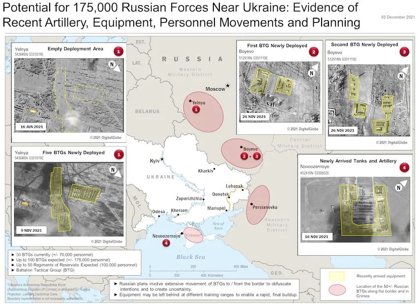 Белый дом в итоге решил раскрыть масштабы продолжающегося наращивания войск у границ Украины. В начале декабря 2021 года администрация опубликовала фотографии со спутника, а также карту, созданную американскими аналитиками, на которой были показаны позиции российских войск, а также анализ российского планирования, проведенный разведывательным сообществом.