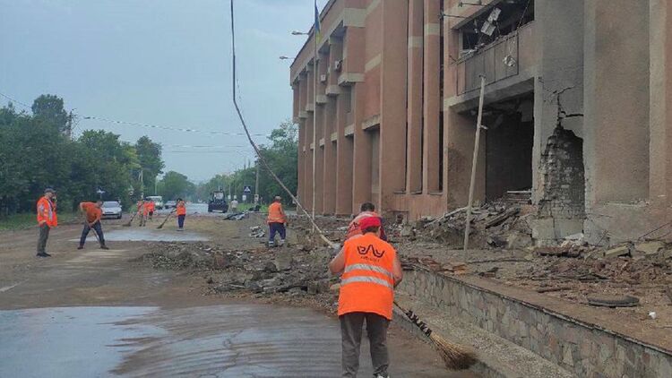Обломки ракеты и ударная волна повредили дома напротив вуза. Коммунальщики расчищают территорию возле университета, чтобы освободить проезд для транспорта.