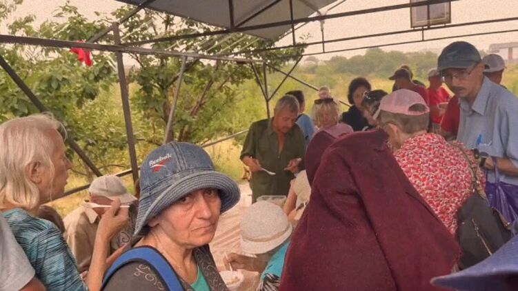 На видео длинная очередь стоит у полевой кухни, в которой готовят кашу в больших кастрюлях.