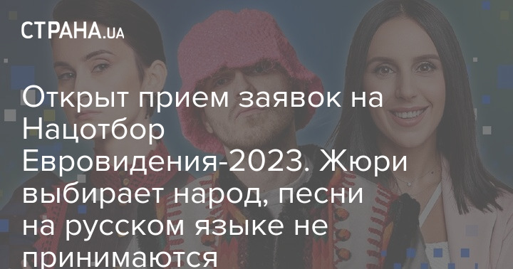 В Украине открыли прием заявок для участия в Национальном отборе на Евровидение-2023. Конечный срок подачи заявок – 15 октября 2022 года. Заявки на участие в Нацотборе принимаются по форме на сайте www.eurovision.ua. Условия отбора конкурсантов этого года предполагают, что песни не должны быть на русском языке.