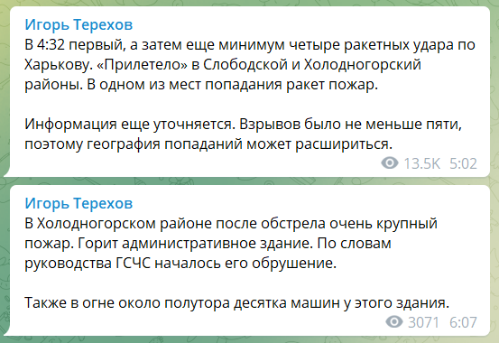 По его словам, в одном из мест попадания ракет в Холодногорском районе начался сильный пожар. Горит административное здание. По данным ГСЧС, началось его обрушение. Также в огне около 15 машин, которые находились возле этого здания.