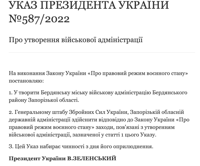 Президент Владимир Зеленский создал в оккупированном Бердянске Запорожской области городскую военную администрацию.