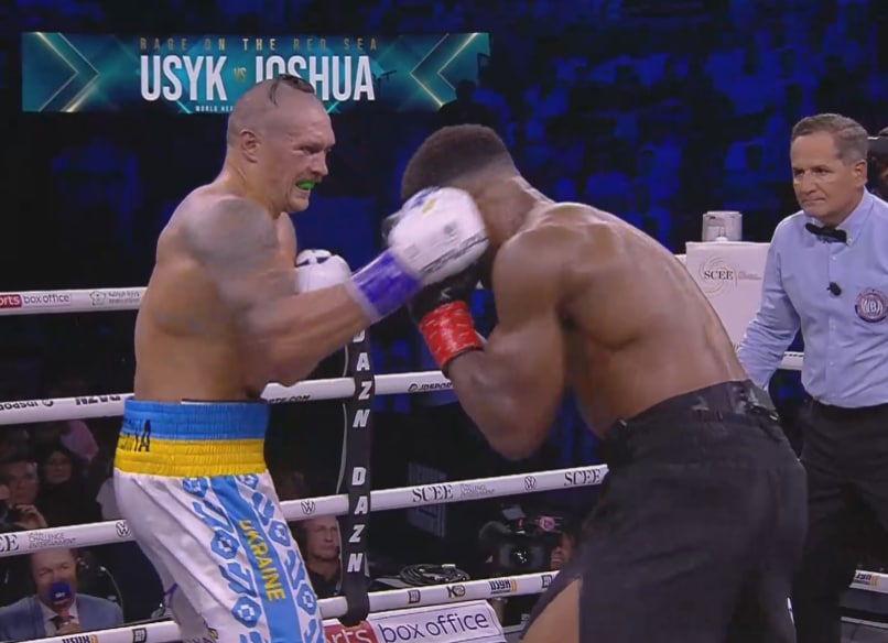 За раунд Джошуа успел пропустить прямой от Усика, украинский спортсмен мастерски ушел в сантиметрах от сокрушительного аперкота Джошуа