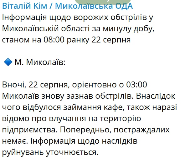 08:44 Около трех часов ночи Николаев подвергся обстрелам, сообщил губернатор Виталий Ким.