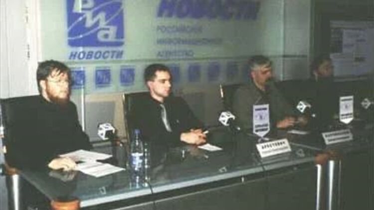 Речь идет о фото с пресс-конференции 2005 года, где вместе за одним столом сидят Александр Дугин, лидер партии "Братство" Дмитрий Корчинский и его тогдашний заместитель Алексей Арестович.