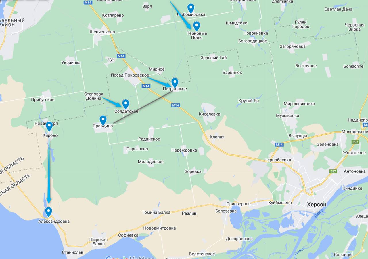 Села, об освобождении которых шла речь, в частности, в статье CNN (со ссылкой на источники в украинском командовании) - Сухой Ставок, Новодмитровка, Архангельское, Томина Балка и Правдино. Не совсем понятно, насколько информация об их освобождении соответствует действительности - особенно по Томиной Балке, которая находится в тылу российских войск и довольно далека от линии фронта.