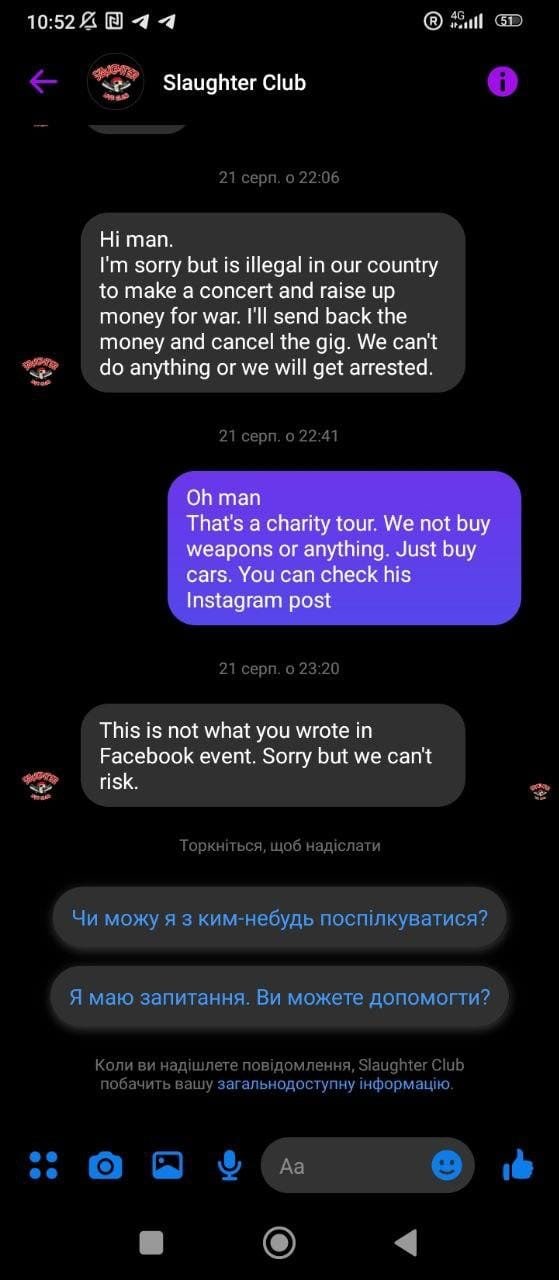 Отметим, что в ответе организаторов, которое прикрепил Жадан, собеседник говорит "This is not what you wrote in Facebook event" (это не то, что вы указали в описании мероприятия в Facebook).