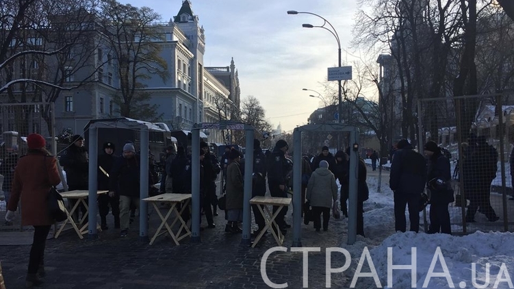 Порядок на акции охраняют около сотни силовиков, которые рассредоточились по улице Институтской. Здесь также стоят еще четыре микроавтобуса с бойцами нацгвардии. Подъезд к НБУ отгорожен сетчатым забором и двумя рамками металлоискателей.