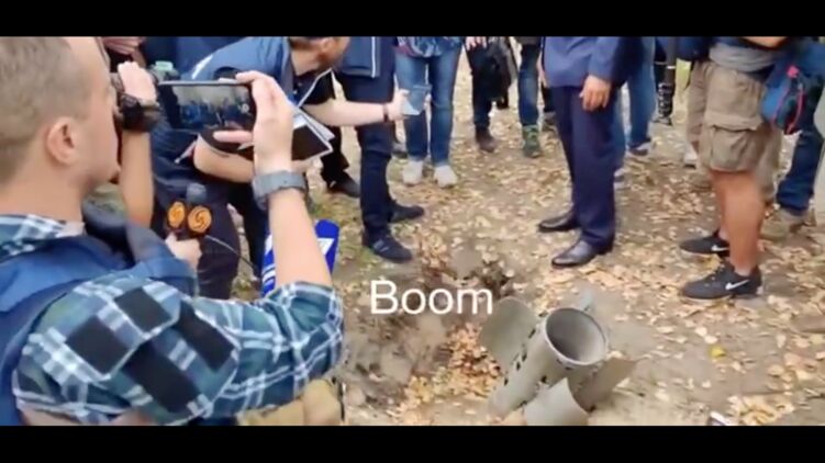 На другом опубликованном видео миссию МАГАТЭ на захваченной станции сопровождают россияне, которые показали один из снарядов, выпущенных по Запорожской АЭС.